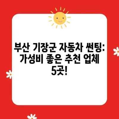이제 부산광역시 기장군의 자동차 썬팅 업체 중 가성비가 뛰어난 5곳을 추천해 드리겠습니다. 각 업체는 우수한 서비스와 다양한 옵션을 제공합니다.